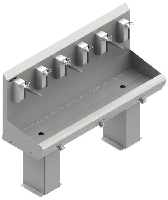 Бесконтактные умывальники коленного включения предназначены для мойки и дезинфекции рук работников и инструмента. Применение коленного клапана подачи воды исключает контакт загрязнённых рук с элементами конструкции и их повторное загрязнение после мытья. Подача воды происходит при кратковременном нажатии клапана. Вода подается в течение 8-10 секунд. Конструкция предполагает предварительную установку требуемой температуры воды, подаваемой в смеситель. В качестве раковины применяется сварная ёмкость.