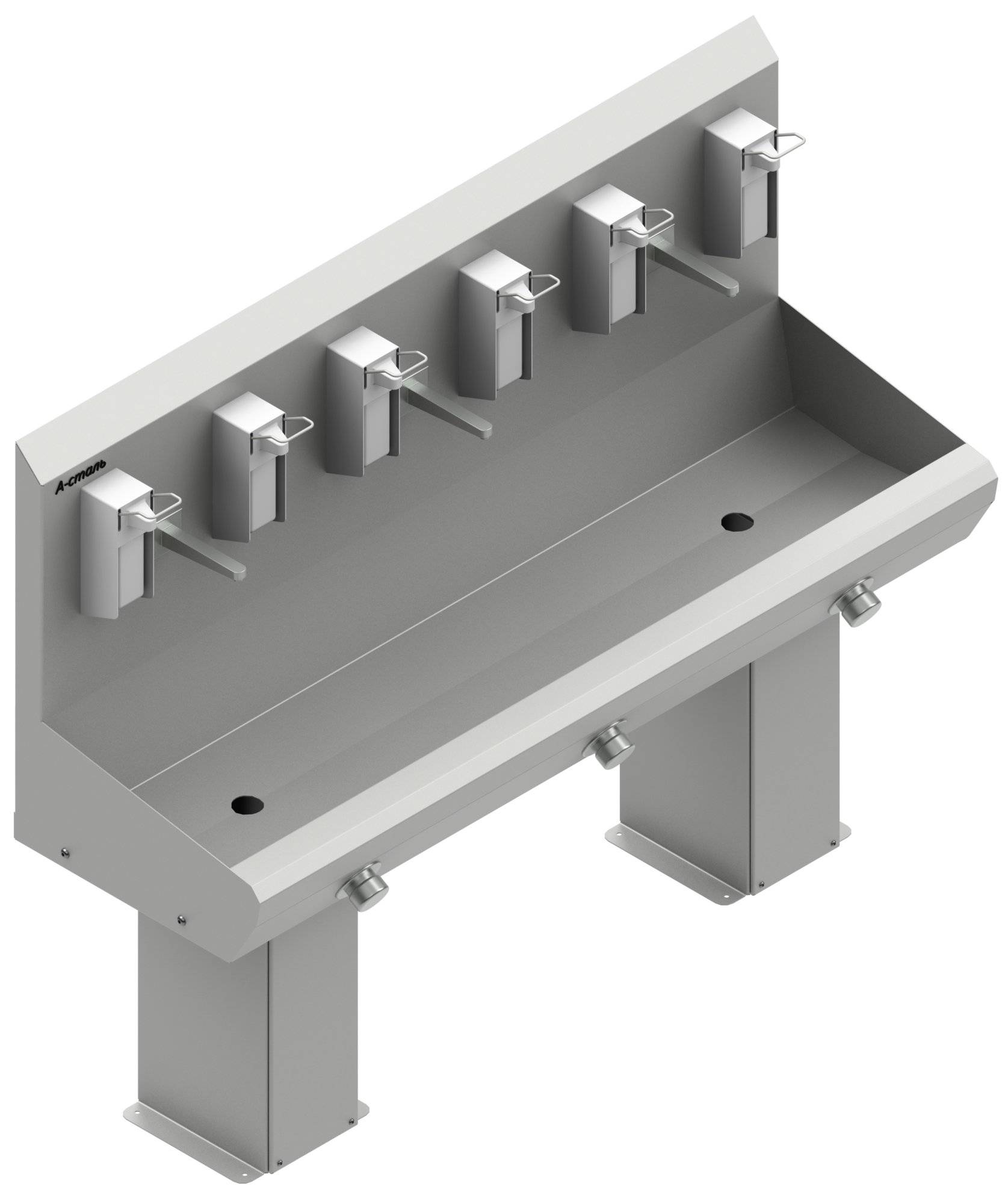 Напольная конструкция оснащается регулировочными опорами для нивелирования неровностей напольного покрытия, возможен жесткий крепеж с помощью анкеров (по согласованию способа установки). Конструкция со стенкой предполагает возможность установки дополнительных локтевых дозаторов жидкого мыла и дезраствора